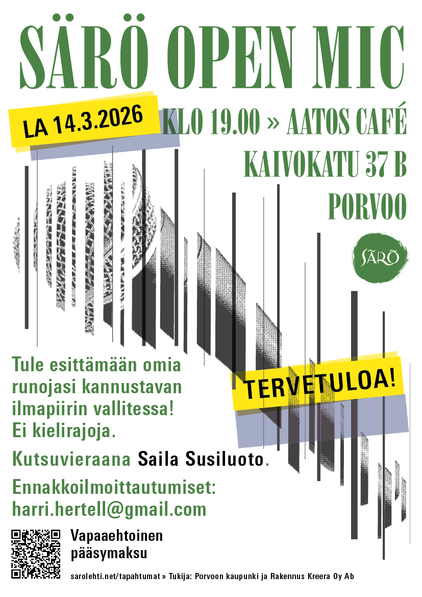 Tule Nuorten Särö Open Mic -runoiltaan esittämään runojasi viiden minuutin ajaksi millä tahansa kielellä – tai vain kuuntelemaan ja kannustamaan muiden esityksiä. Särön runolava on nyt ensi kertaa tarkoitettu erityisesti nuorille (13–25-vuotiaille), mutta tilaisuuteen ovat siitä huolimatta lämpimästi tervetulleita kaikki elävän runouden ystävät, ikään katsomatta. Mikäli lava-aikaa jää, on illan loppupuolella myös vanhemmilla runontekijöillä mahdollisuus esittää omia tekstejään.